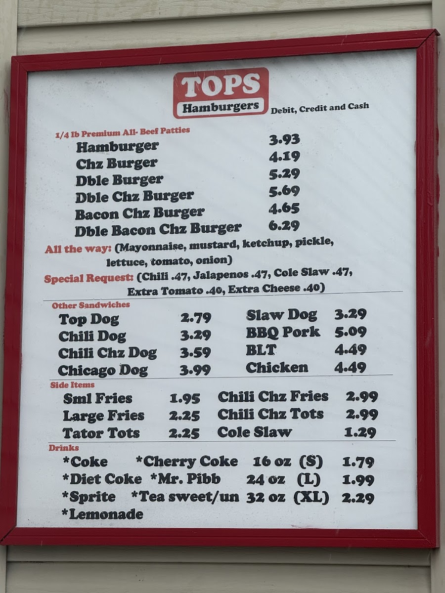 “ I’ve always seen the long lines wrapped around this spot and finally decided to give it a try. Let me tell you—it lived up to the hype. Cheaper than McDonald’s, greasier than Five Guys, fresher than Wendy’s… this is just a straight-up good burger joint. Nothing fancy, just two buns stacked with ketchup, lettuce, tomato, onion, cheese, and bacon—classic and done right. I ordered the double cheeseburger meal with fries and a Coke for only $11. In 2025, you’re not getting this much food for that price anywhere else. The burger itself? Solid 8/10—juicy, flavorful, and hits the spot. The fries? A hard pass for me—too mushy—but let’s be real, you’re coming here for the burger anyway. If you want a cheap, fast, and satisfying meal that doesn’t try too hard but delivers exactly what you’re craving, Tops Burgers is it. Definitely worth trying at least once if you’re in the area. ”